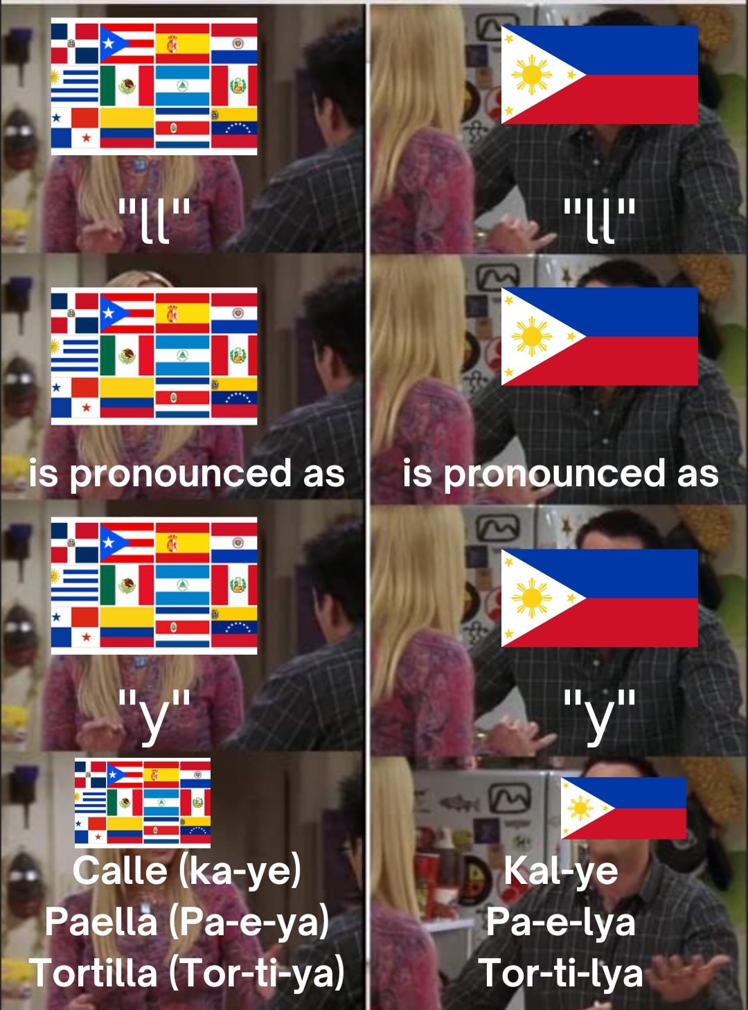스페인어에 이중 L, LL의 발음이 지역마다 매우 다르다. 예를 들어 쌀을 이용한 요리 paella라는 단어는 스페인과 라틴 아메리카 대부분 지역에서는 빠에야로 발음된다. ll 가 y 처럼 발음된다. 이걸보고 yeísmo, 예이스모라고 한다. 아르헨티나, 우루과이, 파라과이에서는 ll가 sh 처럼 발음된다. paella가 빠에샤가 된다. 이걸 sheísmo 셰이스모라고 한다. 근데 필리핀에서는 ll가 들어간 단어나 이름에서 ll를 ly로 발음한다. paella를 빠엘랴로 발음하는 사람들이 많다. 사실 중세 스페인어에서는 모두 이렇게 발음했다. 이걸 lleísmo 례이스모라고 한다. 스페인이 필리핀을 식민지화 한 1565년 경 스페인에서는 례이스모에서 예이스모로의 변화가 진행중이었는데, 필리핀에 이주한 그룹은 례이스모가 강한 카스티야 북부와 레온 등에서 갔고, 멕시코와 중남미는 안달루시아와 카스티야 남부 이민자들이 주로 갔다.