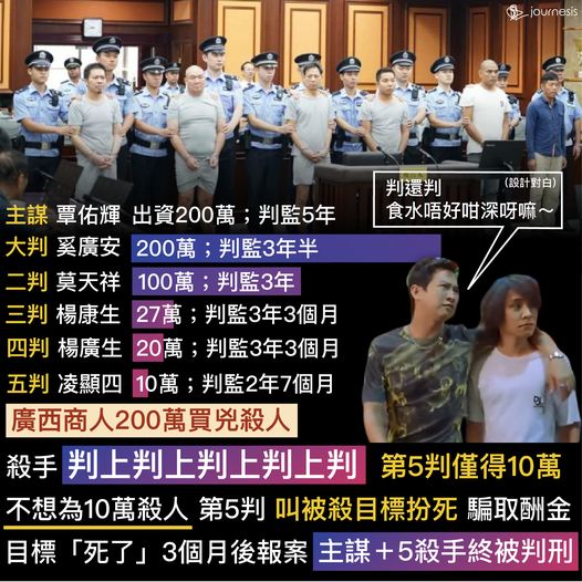 자본주의의 폐단. 사회주의 국가이던 중국이 자본주의를 받아들이며 고도 경제 성장을 얻었으나 효율과 함께 무단 재하도급의 비효율도 겪는 중이다. 2013년에 중국 광시성 난닝시에서 탄요우휘覃佑輝라는 사업가가 경쟁자였던 웨이모우魏傑라는 사업가와 법정싸움을 하다가 지게 되자 제거하기 위해 청부살인자를 약 3억원 정도 주고 채용. 근데 그 청부살인자 갑이 또 다른 청부살인자 을을 한 1.5억원 주고 채용. 근데 이 하청이 병, 정, 무까지 갔다. 최종적으로 1500만원 제안받은 청부살인자 무였던 린시엔스凌顯四는 이 돈으로 할 짓이 아니라고 판단하고 웨이모우와 만나 협상했다. "내가 죽였다고 하고 사진 찍어 보낼 테니까 당신은 좀 죽은척 하고 숨어 사시오." 해서 묶은 채로 찍은 사진 등 촬영. 결국 다 신고. 원청자 형량 5년. 갑 3년 반. 을 3년. 병 3년 3개월. 정 3년 3개월. 무 2년 7개월. https://zh.wikipedia.org/zh-hant/%E8%A6%83%E4%BD%91%E8%BE%89%E9%9B%87%E5%87%B6%E6%9D%80%E4%BA%BA%E6%A1%88