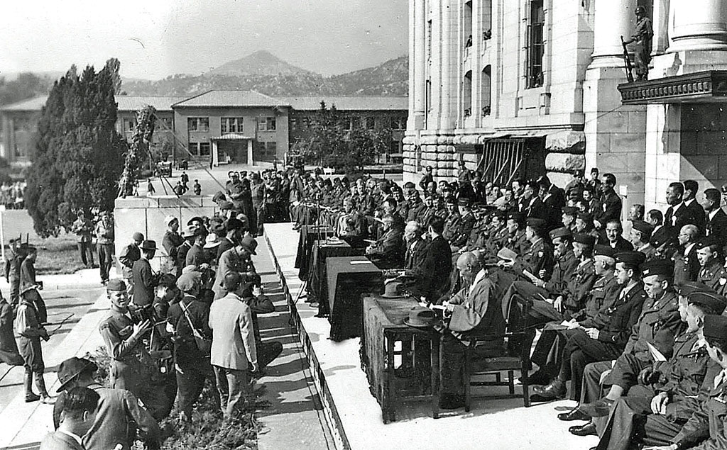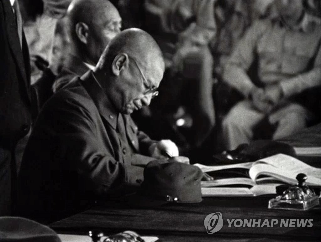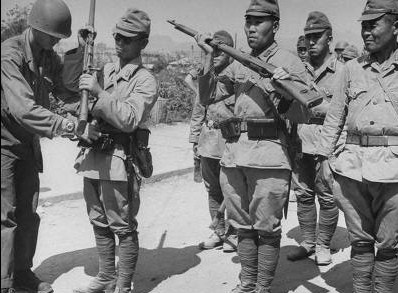하지 중장 앞에서 항복문서에 서명하는 아베 노부유키 조선 총독. 이 바로 전날인가 저전날인가 할복 시도했다가 실패해서 엄청 아픈 상황이었음. 미군의 포로가 된 일본군. 무장 해제.