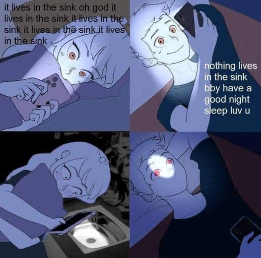 : “싱크 밑에 누가 있어. 싱크 밑에 누가 있어. 싱크 밑에 누가 있어. 싱크 밑에 누가 있어” – “싱크 밑에 누가 있을리가 없잖아 자기야 잘자 사랑해”