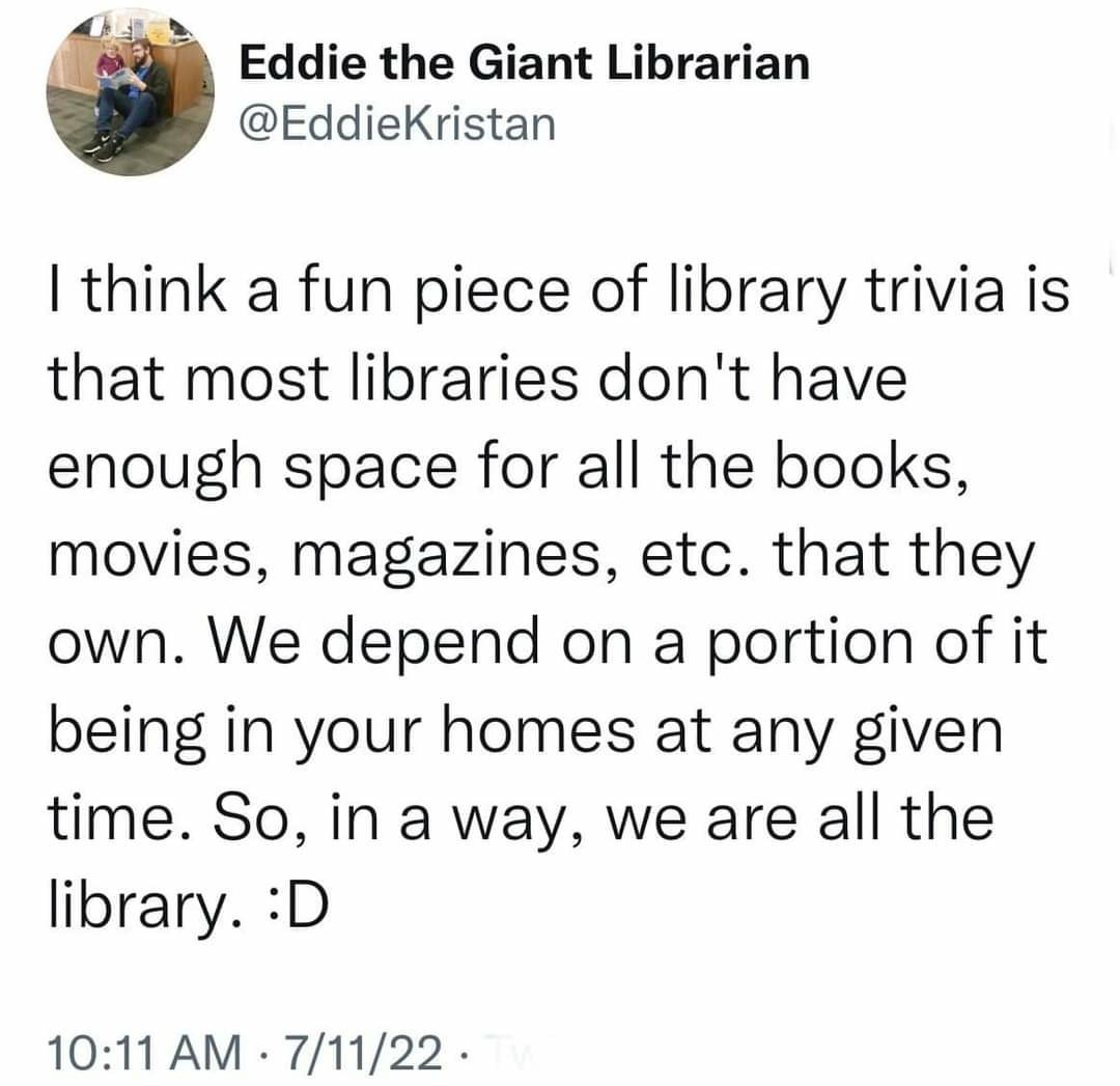 도서관 관련 재미있는 사실: 대부분 도서관들은 항상 책을 보관할 자리가 부족. 상당한 비율로 사람들이 대여해서 집에 보관해줘야 운영됨. 그런 의미에서 우린 모두 도서관.
