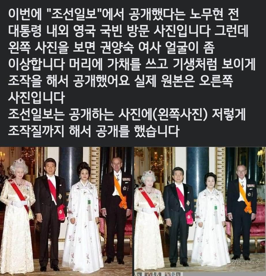 더 많은 사람들이 현혹되기 전에 짚고 넘어가자. 이거 내가 보기엔 노사모에서 나온 사진이다… 옛날부터 저 사진 공유하던 노사모 블로그들이 너무 많다. 저 시절엔 흠모하는 정치인 사진에 포샵해서 공유하는 일도 분명히 있었다… … 노무현 대통령은 8등신으로, 권양숙 여사와 영국여왕 얼굴은 갸름하고 머리채는 크게. 아직 일베가 활약하기 전이라 이런 것에 악의를 느끼거나 하기 전 시절이었다.
