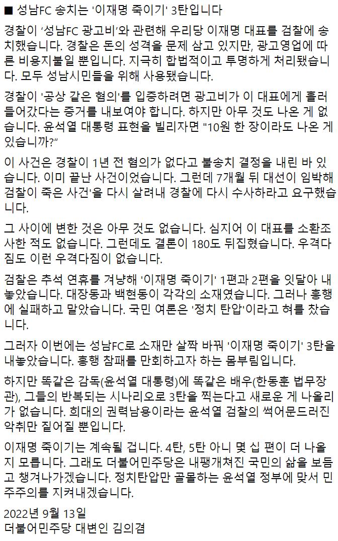 생각해보면 이재명이라는 인물을 그냥 대통령 자리까지 간 천재 행정가가 아니라 노무현이나 김대중 급의 고난과 투쟁의 역사적 인물로 만들고 싶다면 좀 더 큰 고난이 필요하긴 했다. 쇠도 뜨거운 불과 망치질이 있어야 단단해지니. 근데 역사상 가장 인기없고 신뢰도 낮은 대통령이 여론조사에서 국민들이 원하는 지도자로 나오는 야당대표를 탄압한다…. 어차피 당해야 할 망치질이라면 가장 극적인 그림이긴 하다. 사실 김대중이 당했던 탄압에 비하면 아주 안전한 길이기도 하고. 우리가 아무리 욕해도 윤 지지율이 30% 쯤에서 더 이상 떨어지지 않듯, 윤이 이재명을 때리면 때릴 수록 이재명을 돕게 되는 결과가 나올 수 있다.