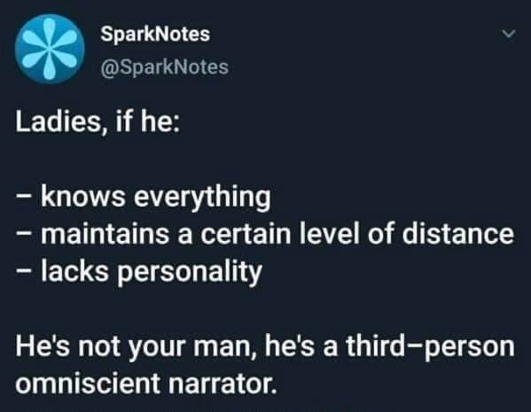 여성분들, 만약 남친이: – 세상 모든 걸 알고 – 어느 정도의 거리를 유지하고 – 개성이 없다면 그 사람은 남친이 아님. 그건 3인칭 전지적 화자임.