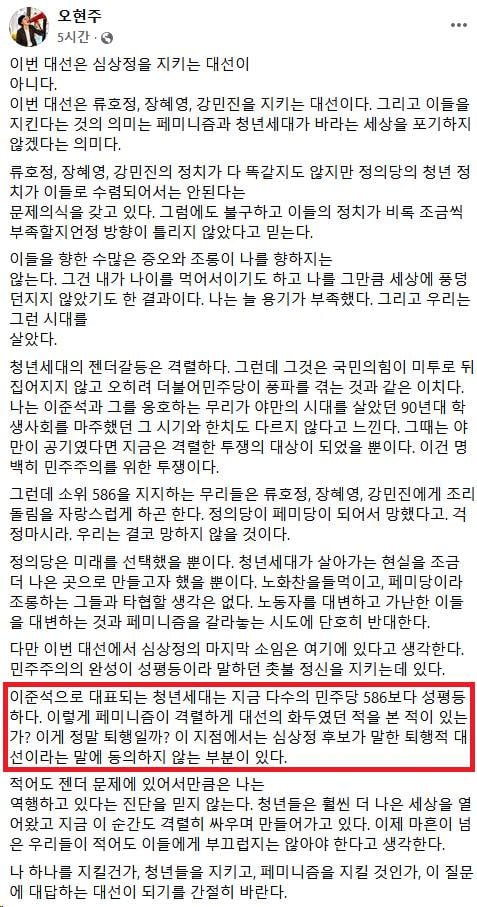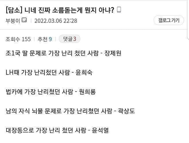 이준석으로 대표되는 세대가 민주당 586보다 성평등하다…. 는 걸 보니 그동안 정의당이 겪었다는 조리돌림이 뭔지 알겠음. "… 아니 검찰이 저 ㅈㄹ하는 걸 보고도 무조건 검찰 발표만 따르네. 미쳤나." "와, 불륜 의혹이 제기됐는데 입 딱 닫고 모른척 하는 것 좀 봐. 국힘보다 더하다." "어떻게 윤석열한테 연대제안을 하냐. 진짜 막나가는구나." 그동안의 이런 지적들이 너무 싫었나 봄. 정상적인 사람들은 저 지경이 되면 자신들의 행동을 좀 돌아볼텐데, 여긴 그냥 '우린 순교자' 이러고 끝까지 가면 된다고 서로 독려하고 있음.