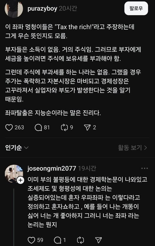 일본, 독일, 프랑스 등 최고세율을 극단적으로 낮추지 않은 나라들은 중산층 붕괴를 매우 느리게 겪었고 특히 90년대 신자유주의 정책 도입 전까지는 매우 안정적인 경제를 즐겼습니다. 자본, 부동산, 배당에 대해 과세 구조를 유지했고 저소득층과 중산층의 세율을 상대적으로 낮게 유지했습니다. 각국에서 정부의 서비스로 돌려받는 부분까지 함께 감안하면 일본 독일 프랑스의 저소득층의 조세부담은 훨씬 낮아집니다. 일본은 정책이 정권에 따라 좀 극단적으로 휘청이긴 합니다.
