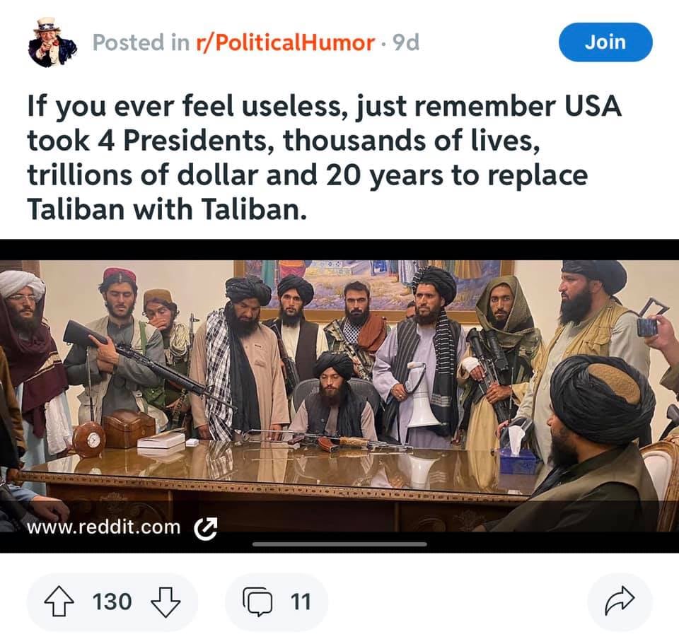 따져보면 탈레반은 원래 무장투쟁하던 애들이 계속 무장투쟁한 거고. 아프가니스탄 시민들은 괜히 죽었고. 미국 정부와 동맹국들은 몇조 달러, 20년, 수천 장병의 목숨을 허비. 미국 군산복합체는 고스란히 몇조 달러 이윤. 중국은 전쟁 시작점 2001년에는 그냥 부상중인 개도국 중 하나였지만 미국이 아프가니스탄과 이라크에서 쓸데없는 전쟁하느라 아무런 견제를 못해서 전쟁 끝날 때에는 중국이 미국과 직접적 경쟁관계가 될 정도로 11배 성장 해버림. 중국은 지금 아프가니스탄에서 쫓겨나는 미국의 모습을 부각시키며 주변국들에게 미국과 동맹 맺어봤자 미국은 보호해줄 능력이 없다는 걸 홍보하는 중. 결국 승자는 군산복합체와 중국.