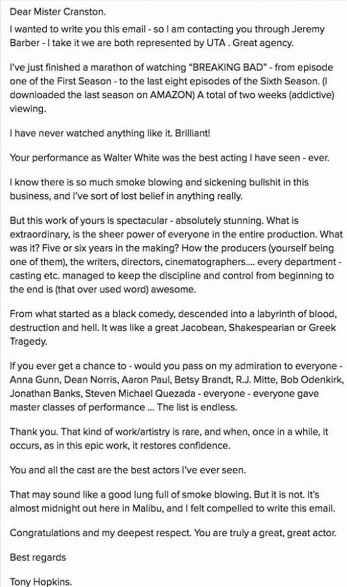 앤소니 홉킨스가 브레이킹 배드를 보고 브라이언 크랜스턴에게 보낸 편지: — 크랜스턴 씨께, 이 메일을 보내고 싶었습니다—그래서 UTA를 통해 당신에게 연락드리게 되었습니다. 우리 둘 다 UTA에서 대리되고 있다고 들었습니다. 훌륭한 에이전시죠. 저는 이제 막 <브레이킹 배드>의 첫 시즌 첫 화부터 마지막 시즌의 마지막 여덟 화까지, 아마존에서 다운로드하여 약 2주간의 중독적인 시청을 마쳤습니다. 이런 작품은 한 번도 본 적이 없습니다. 정말로 놀라운 작품이었습니다! 월터 화이트 역에서 보여주신 당신의 연기는 제가 본 연기 중 최고였습니다—단연코. 이 업계에는 헛된 말들이 참 많다는 것을 잘 알고 있습니다. 그래서 사실 저는 거의 모든 것에 대해 믿음을 잃은 상태였죠. 그러나 이 작품은 대단합니다—완전히 압도적입니다. 무엇보다도 이 작품에서 놀라운 점은, 제작에 참여한 모든 사람들의 놀라운 힘이 결집된 것입니다. 5년인가 6년 동안 촬영한 걸까요? 제작진, 감독, 작가, 촬영감독, 모든 사람들이 완벽하게 캐스팅을 했고, 그 흐름을 조율하며, 그 모든 과정을 지휘하는 데 있어서 (그 진부한 단어를 쓰자면) 대단한 통제력을 발휘했습니다. 정말 대단한 작품이었습니다. 처음에는 블랙 코미디로 시작했지만, 이 작품은 피와 파괴의 미로로 변모했으며, 마치 거대한 자코비안 비극이나 셰익스피어, 혹은 그리스 비극을 보는 듯했습니다. 기회가 된다면, 저를 대신해 모든 분들께 제 인사를 전해 주시겠습니까?—안나 건, 딘 노리스, 아론 폴, 베치 브란트, RJ 미테, 밥 오덴커크, 조나단 뱅크스, 스티븐 마이클 케사다 등—모두가 정말로 놀라운 연기 수업을 보여주셨습니다. 목록을 적어보니 끝이 없습니다. 고맙습니다. 그런 종류의 예술은 매우 드물고, 그것이 이런 서사적인 작품에서 나타날 때면 우리 모두를 고양시킵니다. 당신과 모든 배우들은 제가 본 최고의 배우들입니다. 이 말이 빈말처럼 들릴 수 있지만, 전혀 그렇지 않습니다. 말리부의 한밤중에 이 글을 쓰며, 이 메시지를 전해야겠다는 강렬한 충동을 느꼈습니다. 축하드리며 진심으로 존경을 표합니다. 당신은 정말 위대한, 위대한 배우입니다. 진심을 담아, 토니 홉킨스 드림 —— ChatGPT-4o 번역 참 잘하네.. 거의.