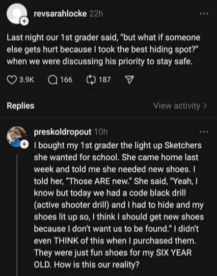 6살짜리 딸아이에게 불빛이 나는 신발을 사줘서 좋아하며 학교에 갔는데 나중에 다른 신발 사달라고 함. 왜냐고 물으니 학교에서 총기 난사 사건 대비 숨는 연습을 하는데 신발이 반짝여서. 자기는 들키기 싫으니 다른 신발을 사달라고 했다 함.