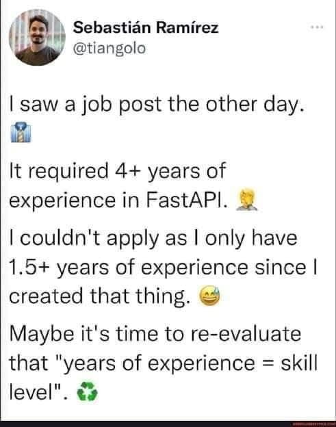 “구인공고를 봤는데 FastAPI 경력 4년 이상을 요구했다. 난 지원 자격이 안되는데, FastAPI는 겨우 1년 반 전에 내가 만들어 배포한 프로그램이기 때문이다. 이제 실력을 연수와 동일시하는 건 그만해야하지 않나 싶다.”
