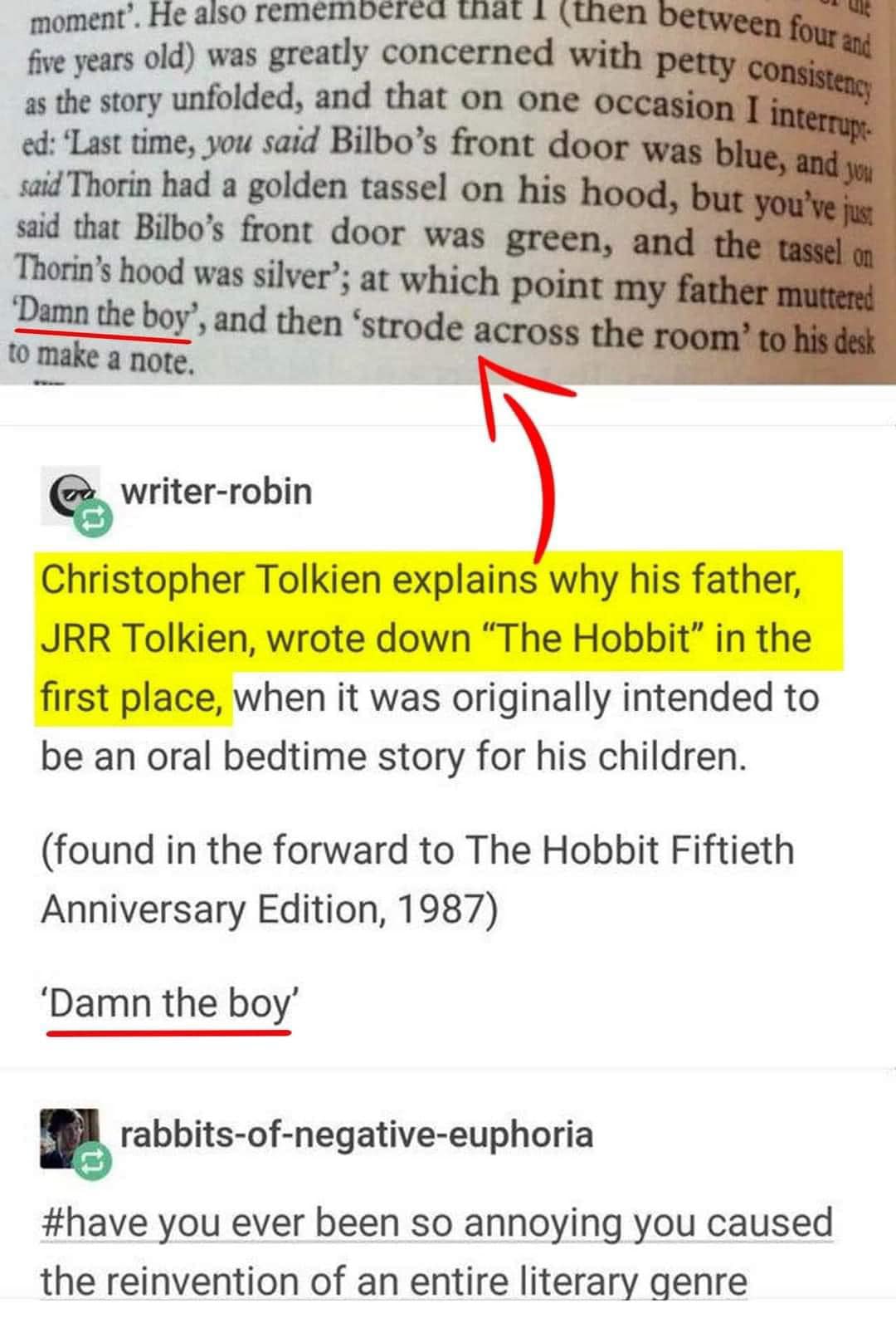“아빠가 자기 전에 들려주는 이야기들 중에 자꾸 틀리는 게 많았다. ‘아빠 저번엔 빌보네 앞문이 파란색이고 소린의 망토에 달린 술(태슬)이 황금색이라고 했잖아요. 오늘은 왜 앞문이 녹색이고 소린의 망토가 은색이라고 하세요?‘ 아빠는 ‘망할 놈’ 이라는 말을 남기고 책상에 가서 필기를 하기 시작했다.” J R R 톨킨의 아들 크리스토퍼 톨킨이 전하는 소설 [호비트]와 반지의 제왕 세계가 탄생하게 된 비밀.