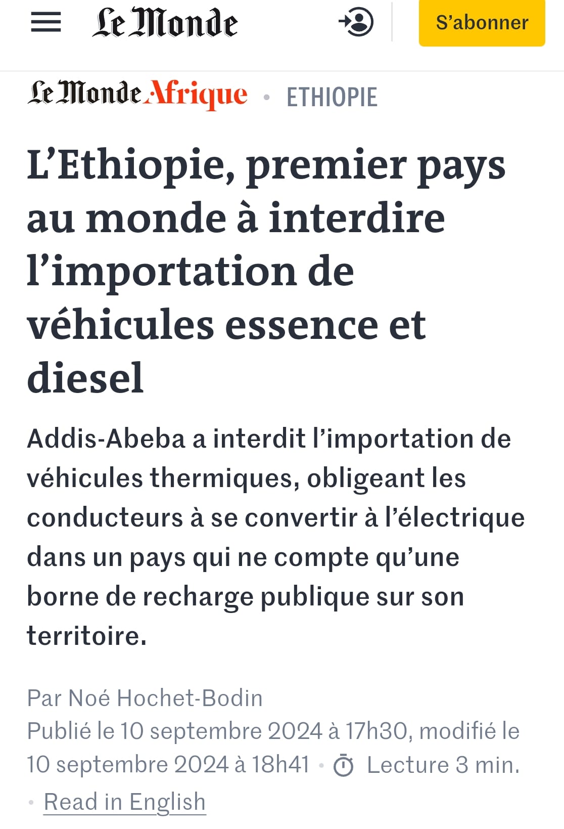 에티오피아가 모든 내연기관차 수입을 금지. 앞으로 전기차만 수입 가능. – 전국에 전기차 충전소 딱 하나 있음. – 인구 1억 2천만 명. – 전체 가정의 절반은 전기가 없음. – 내전 중. 사실 진짜 이유는 어차피 보유한 외환이 다 떨어져서 임.