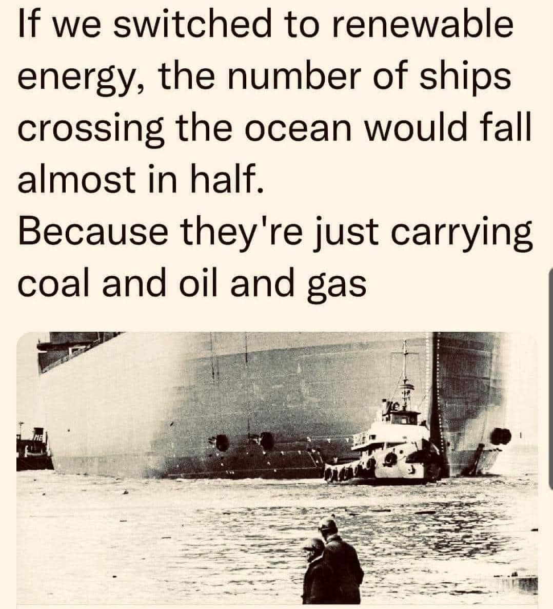 인류가 모든 연료를 재생에너지로 전환하면 세계를 운항하며 바다를 오염시키는 배들의 절반을 줄일 수 있다. 지금 다니는 배들의 절반은 석탄, 기름, 가스 운반선들이다.