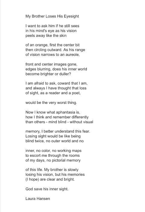 **우리 오빠가 시력을 잃다** 나는 그에게 묻고 싶다 그가 여전히 마음의 눈으로 보는지, 시야가 사라질 때 그의 시야가 오렌지 껍질처럼 벗겨지는지. 먼저 중심부가 사라지고 그 후 외곽으로 퍼져나가는지. 그의 시야가 좁아지면서 후광이 되는지, 앞과 중앙의 이미지가 사라지고 가장자리가 흐려지면서 그의 내면 세계는 더 밝아지거나 흐려지는지. 나는 묻는 것이 두렵다, 겁장이라서 항상 생각해왔던 것은 독자로서, 시인으로서, 시력을 잃는 것이 가장 끔찍한 일일 것이라는 것. 이제 나는 아판타시아가 무엇인지 안다, 내가 어떻게 생각하고 다르게 기억하는지 – 마음의 시각 없이, 나는 이 두려움을 더 잘 이해한다. 시력을 잃는다는 것은 두 번의 실명과 같을 것이다. 외부와 내부 모두 없다. 내부도, 색도, 내 나날의 추억을 안내할 지도도 없이, 시각적 기억이 없이. 우리 오빠는 천천히 시력을 잃어가지만, 그의 기억은 선명하고 밝다(꼭 그게 사실이길) 하나님, 그의 내면의 시력을 구하소서. – 로라 한센