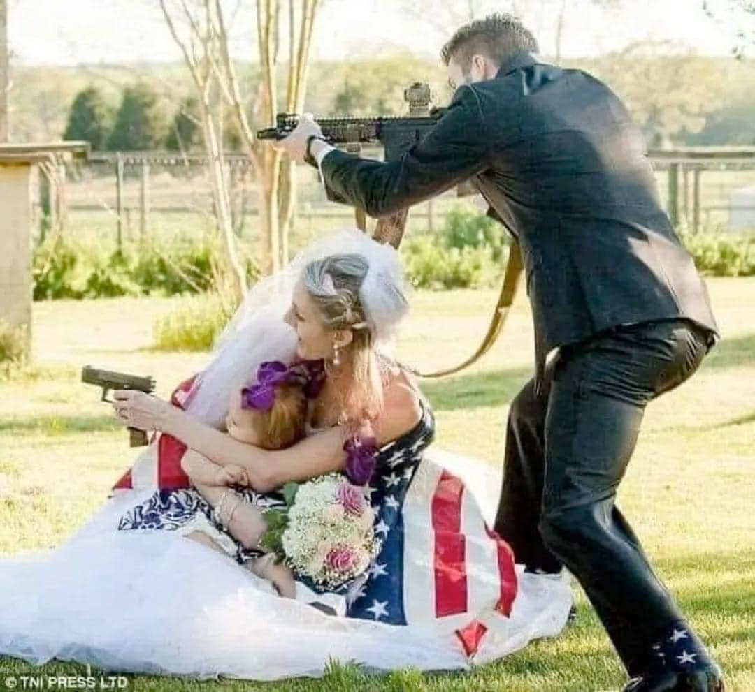 하여튼 미국넘덜 총든 영웅 환타지는 끝을 모름. 웨딩 포토인 모양. 진지하게 말하자면 부인과 아이 뒤에 숨어서는 충분한 엄폐가 되지 못함. 일단 더 견고한 건물이나 자동차 엔진블락 등 뒤로 이동부터.