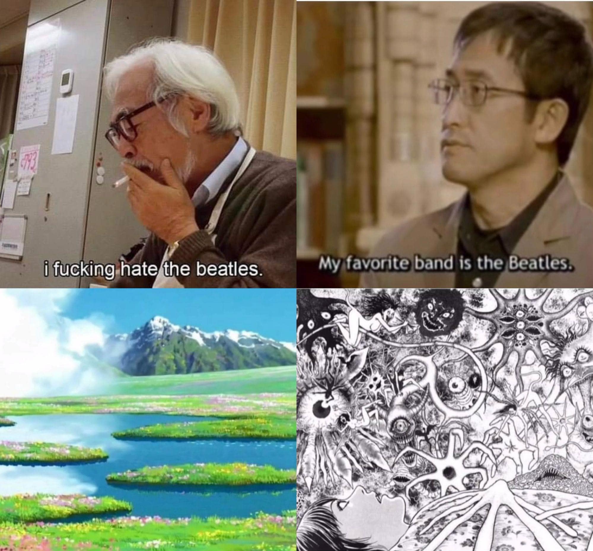 하야오: 난 비틀즈 ㅈㄴ 싫어해. 준지: 내 최애 밴드는 비틀즈입니다.