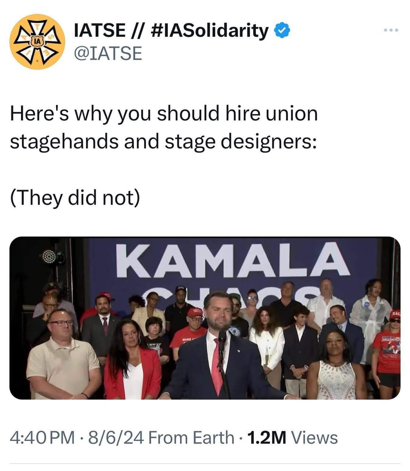미쿡이나 한국이나 우파는 돈도 좋아하는 것들이 꼭 정성을 쏟아야할 곳에는 꼭 돈을 아낄려고 함. 아마 가장 싼 인력을 찾아 무대를 맡겼다가 벌어진 일. 트럼프 러닝메이트 밴스가 유세하는데 화면에 카말라 해리스 홍보가 뜸. 사실 ”카말라는 혼돈“이라는 메시지를 띄우려던 거겠지만… 자신들이 무대에 서서 혼돈 부분을 가려서 카말라만 뜸.