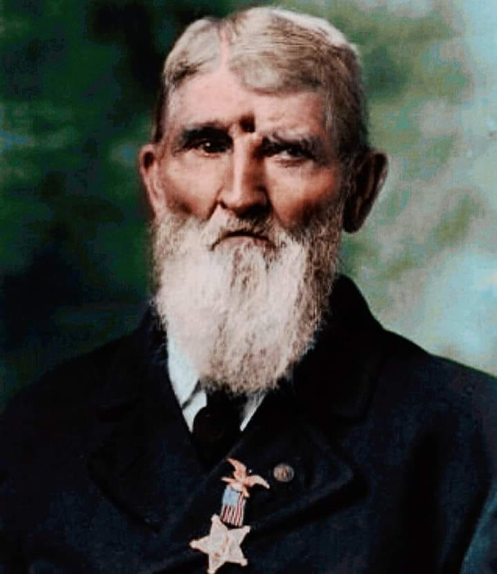 1863년 남북전쟁 때 북군으로 참전했다가 머리에 총을 맞은 군인. 총알 조각은 결국 못 빼냈는데 54년을 더 사셨다 함. 1911년 사진.