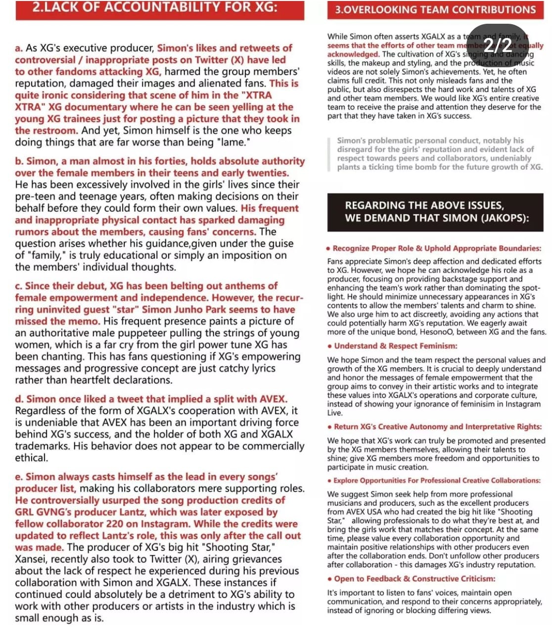 SIMON JAKOPS/박준호라는 한일 혼혈 미국 국적인이 일본인 KPOP 걸그룹 XG의 프로듀서라는데, 아마 그룹 키우는 거 포기하고 지금까지의 성공을 자신의 가수/DJ 커리어로 연결하려고 노력중이라는 소문. JYP는 걸그룹 노래에 JYP라는 시그니쳐를 넣을 때 그래도 신인에게 인지도를 높여준다는 명분으로 하는데, 이분은 그냥 XG 공연 무대에 혼자 나와 20분간 자기 솔로 공연하는 일도 있다고… XG의 공식 팬덤 ALPHAZ가 그 외에도 여러가지 문제를 제기하며 XG를 죽여서라도 자기가 뜨려는 사이몬은 빠져라 하고 있는 모양. AVEX 산하 레이블 소속이라 상표명 등이 다 AVEX건데 사이몬도 한국에 누구처럼 AVEX로부터 독립하겠다느니 하고 있다는 주장도 나옴.