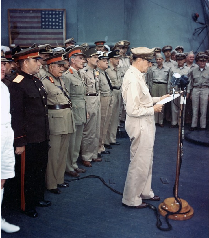 미주리 함에서 일본의 항복선언서에 서명 받는 맥아더. 뒤에는 페리 제독이 일본을 처음 강제로 개항했을 때 달았던 성조기. 윤과의 만남 장소로 민씨 황후 시해하고 조선을 지배하기 시작한 1895년 개업한 렌가테이를 고집했던 기시다 총리.